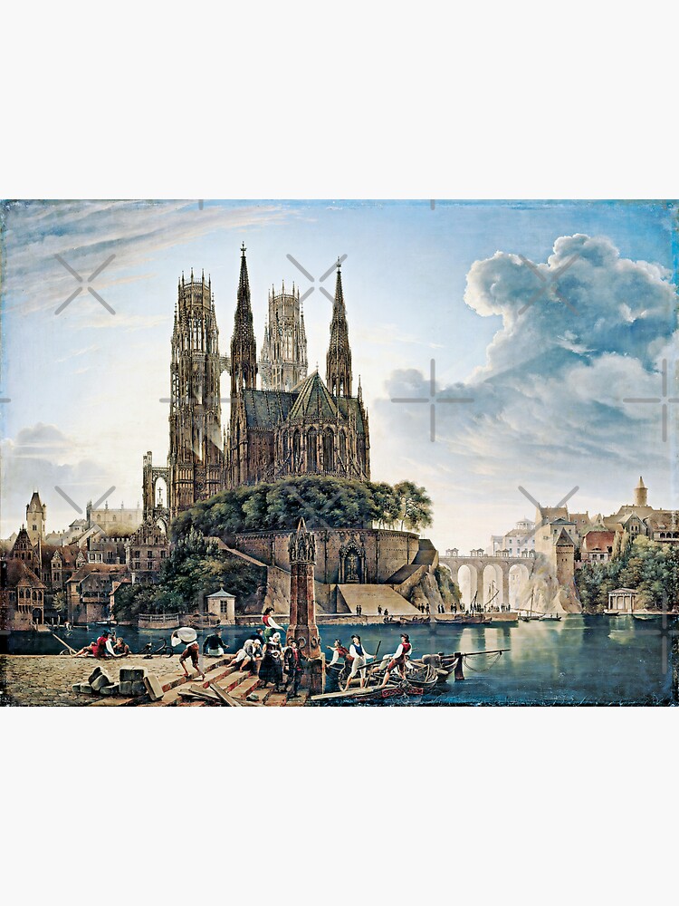 Es zeigt einen viertürmigen gotischen Dom, der auf einer felsigen Insel erhöht über einer mittelalterlichen Stadt mit kleinem antiken Prostylostempel am rechten Bildrand, und einen klassizistischen Bau mit einer Vorhalle. Weitere Elemente der Stadt sind in der Gotik und Renaissance nördlicher europäischer Breiten zuzuordnen. Es handelt sich bei der dargestellten Kathedrale um eine monumentale Architektur, die in ihrer filigranen Ausprägung einer idealisierten Gotik ein theatralisch anmutendes Abendlicht durchscheinen lässt.